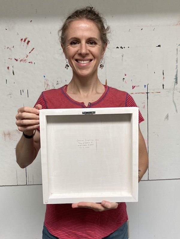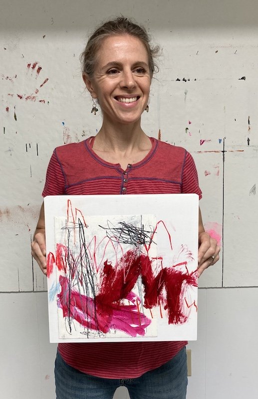 This is an original mixed media painting, signed on the front and hand labeled on the back by the artist. It features a range of materials: paper collage, acrylic, watercolor, pastel, ink, and graphite on a hardwood panel. The panel is made of basswood and is braced with a basswood cradle. This type of painting support has been valued since the 14th century for its strength and smooth surface.