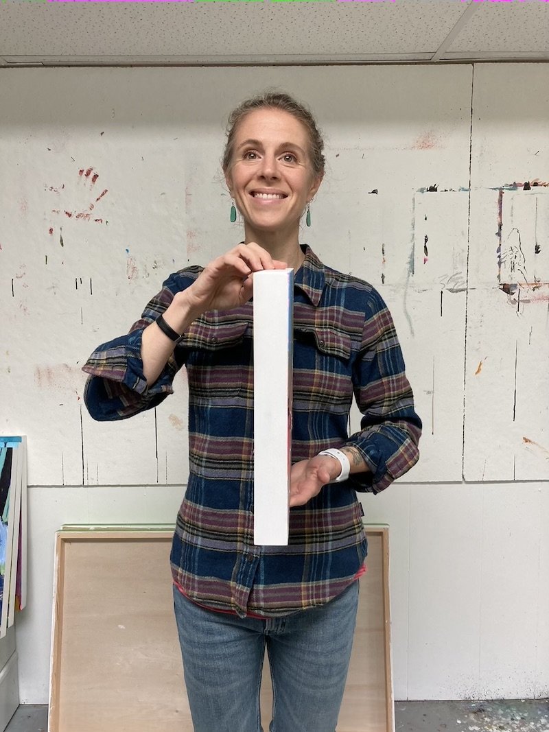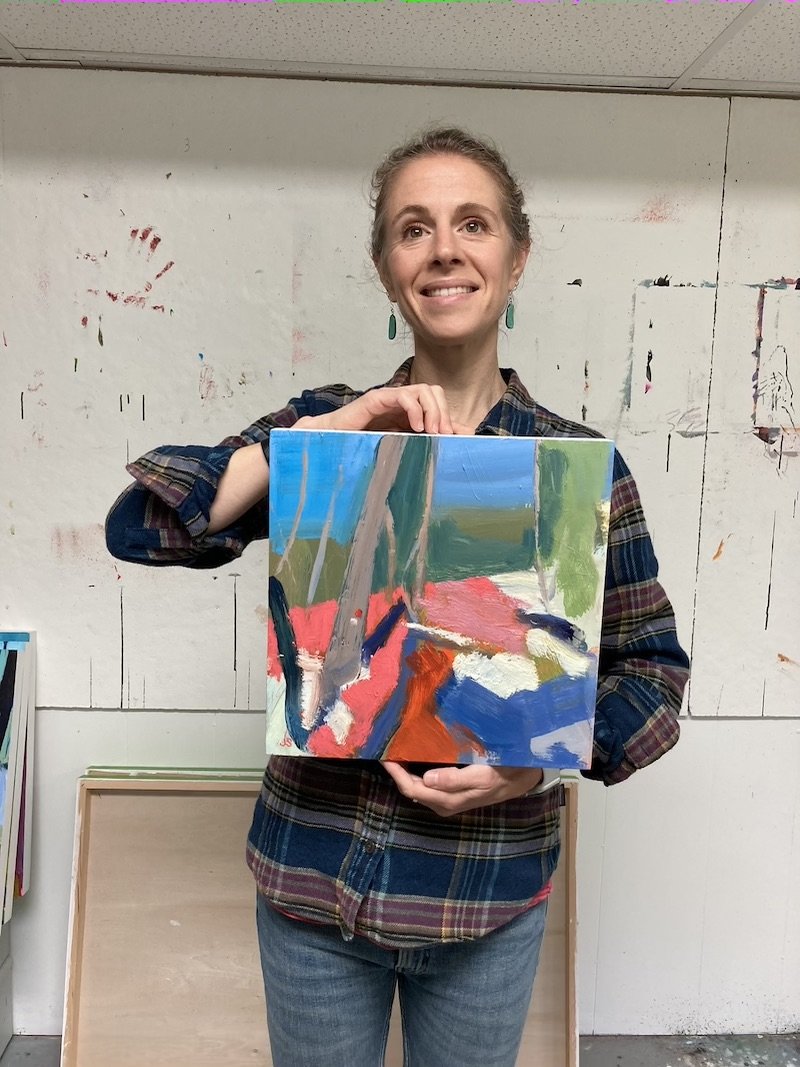 This painting is part of a series of works inspired by a snowy winter family hike in Pilot Mountain State Park in North Carolina. Pilot Mountain was historically used as a navigational landmark by the area’s first inhabitants, who named it “Jomeokee” or “great guide.” During our hike I was struck by the contrast between the stark lines of the trees against the softer shapes of rock, patches of snow, and sky, so I took some photos as we walked. These photos were a jumping off point for this series, and I enjoyed the challenge of finding a balance between representation and abstraction. I hope this painting will inspire you and bring you deep contentment.