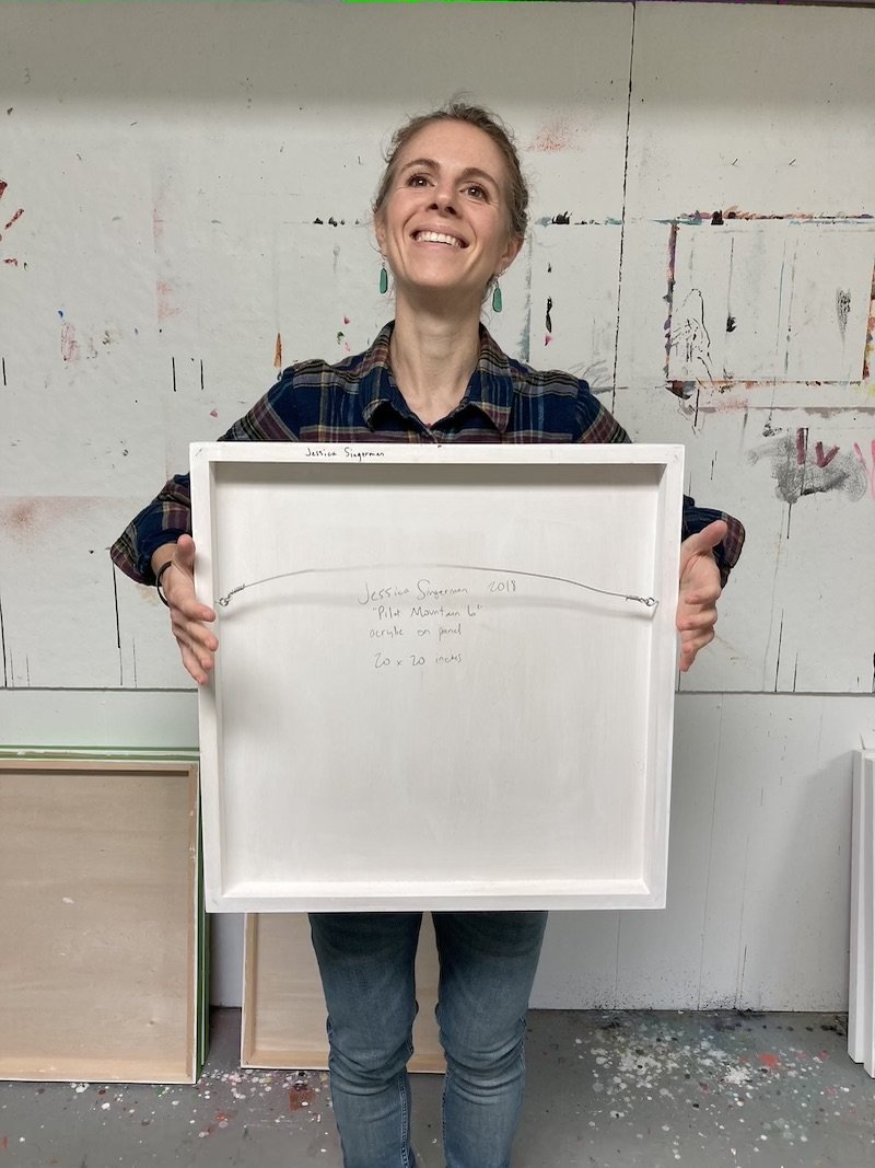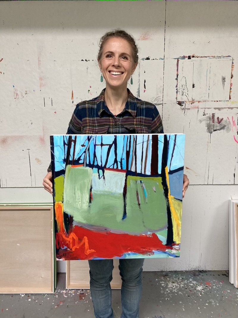 This painting is part of a series of works inspired by a snowy winter family hike in Pilot Mountain State Park in North Carolina. Pilot Mountain was historically used as a navigational landmark by the area’s first inhabitants, who named it “Jomeokee” or “great guide.” During our hike I was struck by the contrast between the stark lines of the trees against the softer shapes of rock, patches of snow, and sky, so I took some photos as we walked. These photos were a jumping off point for this series, and I enjoyed the challenge of finding a balance between representation and abstraction. I hope this painting will inspire you and bring you deep contentment.