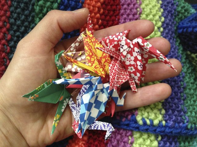 I found some tiny sheets of very pretty paper today. Happiness! So here are 10 more cranes to add to the bunch. 191 total now